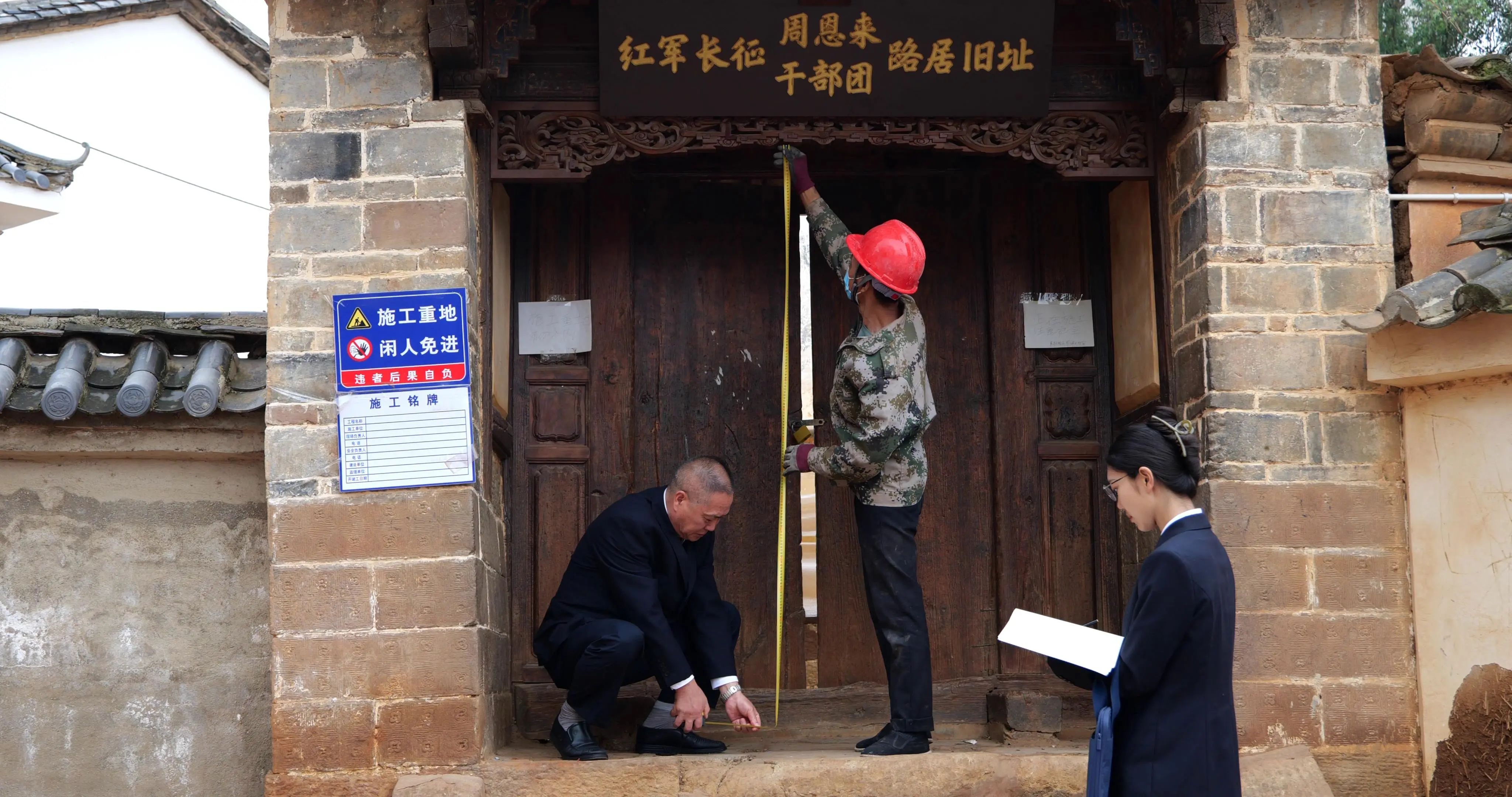 云南省禄劝县检察院检察官来到周恩来及干部团路居旧址查看修缮工作进度。