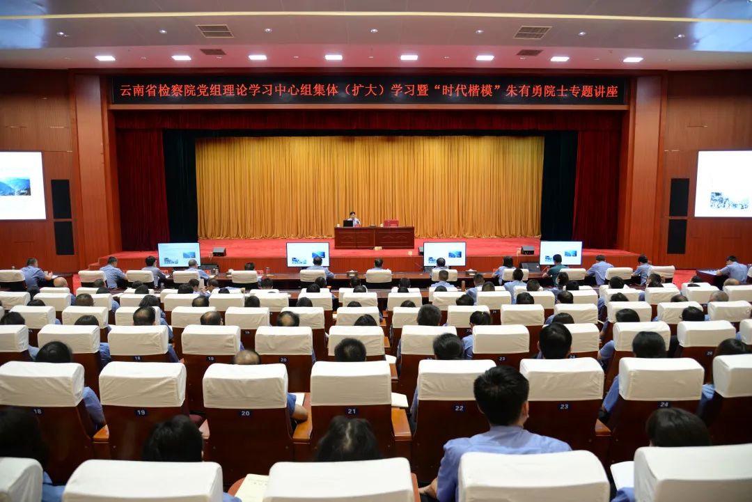 7月22日,云南sp小馆 召开“sp小馆 党组理论学习中心组集体(扩大)学习暨‘时代楷模’朱有勇院士专题讲座”,本次讲座同时也是sp小馆 “云检讲坛”第二讲。讲座由sp小馆 党组书记、检察长王光辉主持,sp小馆 党组班子成员、检委会专职委员、厅级干部,省院机关全体检察人员齐聚一堂,共同学习。