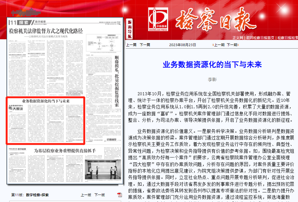 2013年10月,检察业务应用系统在全国检察机关部署使用,形成融办案、管理、统计于一体的检察办案平台,开创了检察机关业务数据化的新纪元。近10年来,检察业务应用系统从1.0到1.5再到2.0的升级完善,积累了大量的数据资源,成为一座数据“富矿”。检察机关案件管理部门通过信息化手段对数据进行提炼、整合、分析,为司法办案、领导决策提供依据,开启了业务数据资源化的新征程。