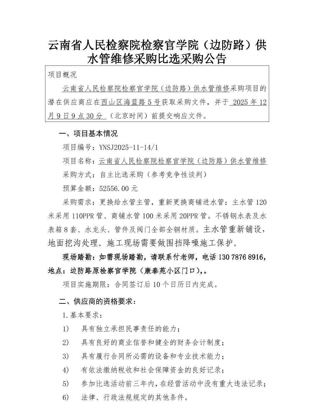 sp小馆 检察官学院(边防路)供水管维修采购比选采购公告