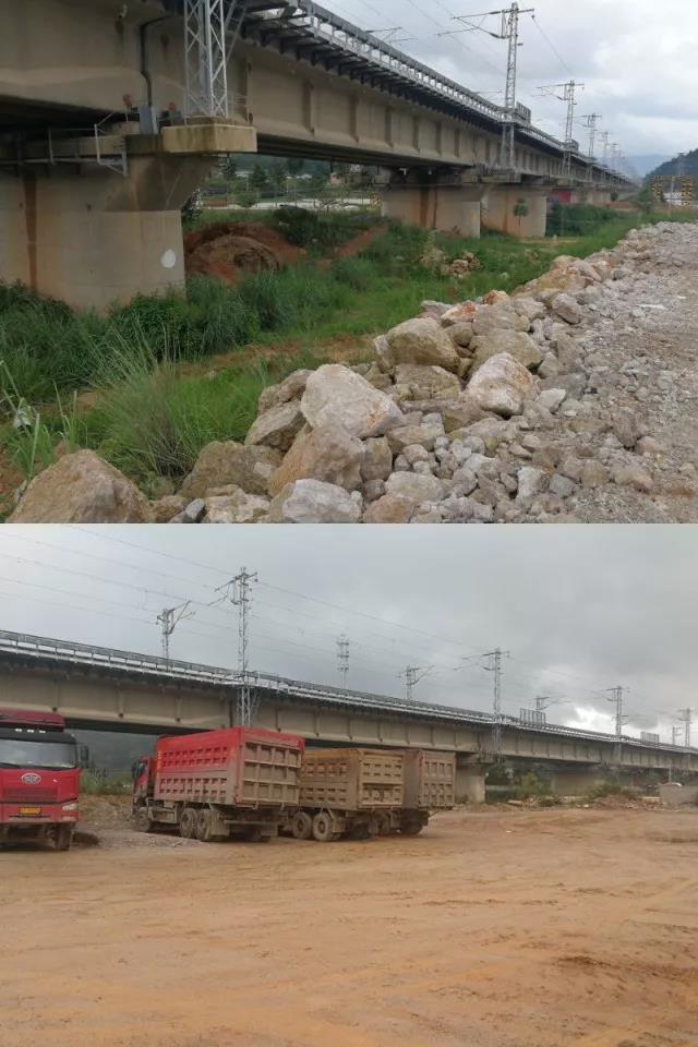昆玉河线的运行,对完善铁路网,更好服务和融入国家“一带一路”,面向南亚东南亚辐射中心建设,具有重要意义。目前每天有4 对动车组以及多趟普通旅客列车运行,下一步将开通高铁,昆玉河线涉及站点之一河口县,与越南老街市、谷柳市隔河相望,而位于柴河双线特大桥左侧的主营砂石料开采的某公司,将大量弃石、弃渣堆积成山,距离桥梁最近处仅5米,且将桥下紧挨约百米长防护围墙的一整片土地均用碎石渣铺垫,导致整个地面高度被人为抬升约2 米。而桥梁右侧为农田,土质松软,加之左侧大面积近距离堆放石渣,极易造成轨道变形、桥梁歪斜等,安全隐患风险极高。