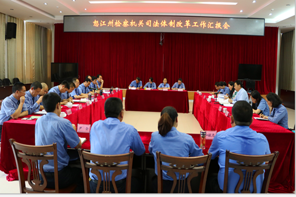 怒江州检察院党组书记、检察长刘强云主持召开汇报会,向调研组一行汇报了怒江州检察机关司法体制改革基本情况、主要做法、存在问题及意见建议。泸水市检察院党组书记、检察长丁金龙补充汇报了泸水市检察院司法体制改革推进情况。怒江州、市两级院入额检察官代表(含“双语”入额检察官代表)、检察辅助人员代表、司法行政人员代表先后发言,提出了“适当增加民族自治地方双语入额检察官”等意见建议。