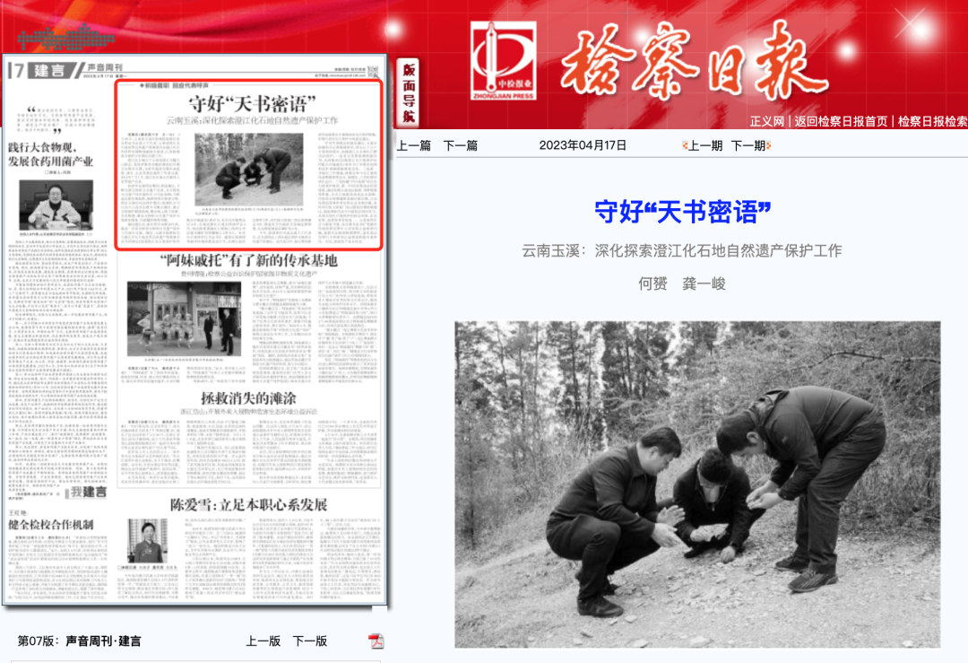 建议提出后,张仕明主动联系代表,就进一步深化探索文物和文化遗产保护工作进行交流。随后,玉溪市检察机关与澄江市化石地世界自然遗产管理委员会共同制定《加强澄江化石地保护协作配合实施意见(试行)》,先后召开联席会议4次,实地巡察化石地自然保护区6次,依法批准逮捕化石地核心保护区非法盗采磷矿犯罪嫌疑人2件8人。针对化石地保护区非法采矿、建筑垃圾填埋等破坏环境资源违法行为,办理公益诉讼案件2件,向行政主管部门发出检察建议2份,督促有关行政机关加强监督管理,生态修复被盗采磷矿坑3处。